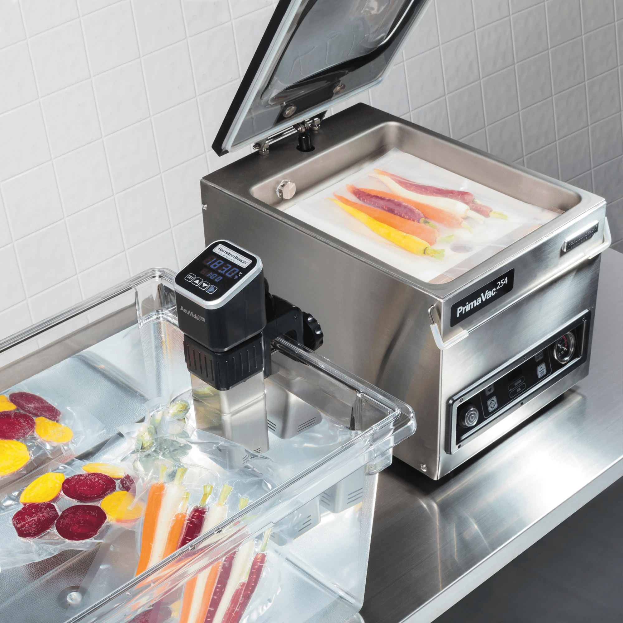 W połączeniu z pakowarkami komorowymi z linii PrimaVac™ stanowi kompletne rozwiązanie do komercyjnego gotowania sous vide.