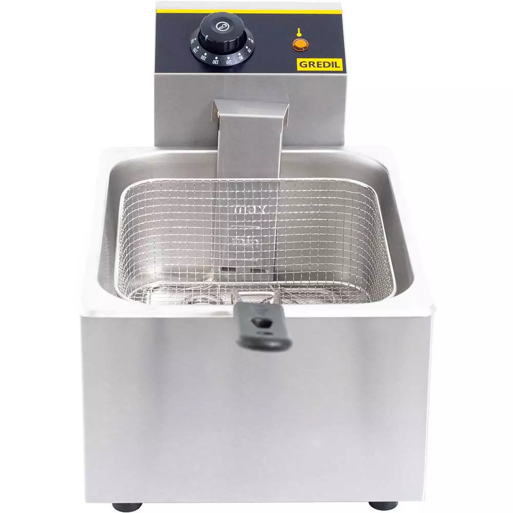 Frytownica elektryczna Gredil – profesjonalna frytownica gastronomiczna do smażenia w głębokim tłuszczu, stal nierdzewna, pojemność 5 l (8 l całkowita), moc 3,2 kW, termostat 60–190°C, 260x420x(H)270 mm