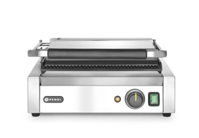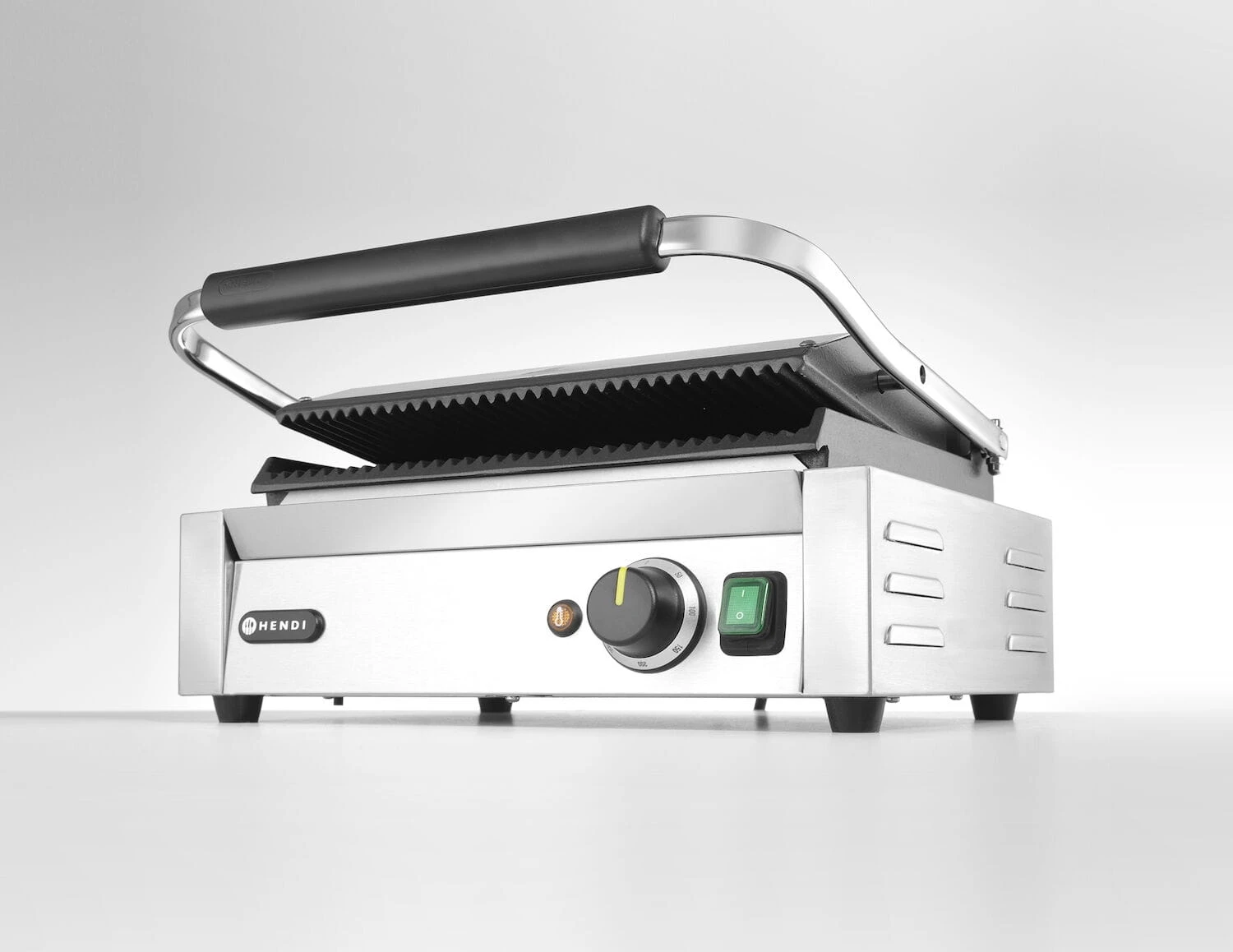 Grill kontaktowy Panini HENDI z płytami góra i dół ryflowane to profesjonalny grill kontaktowy gastronomiczny przeznaczony do szybkiego przygotowywania panini, tostowanego pieczywa, mięsa oraz warzyw. Dzięki kompaktowej konstrukcji, wysokiej mocy i precyzyjnej regulacji temperatury urządzenie sprawdza się w barach, bistrach, food truckach, lokalach gastronomicznych i punktach małej gastronomii, gdzie liczy się wydajność, trwałość i powtarzalny efekt grillowania.