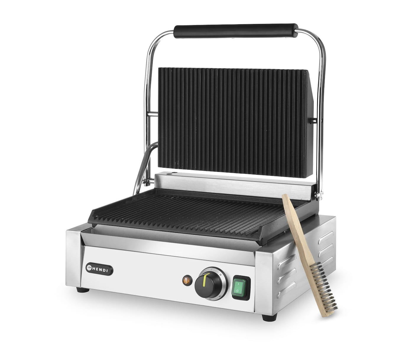 Grill kontaktowy Panini HENDI – góra i dół ryflowane, grill gastronomiczny do panini, mięsa i warzyw, 230V/2200W, 430x375x(H)216 mm