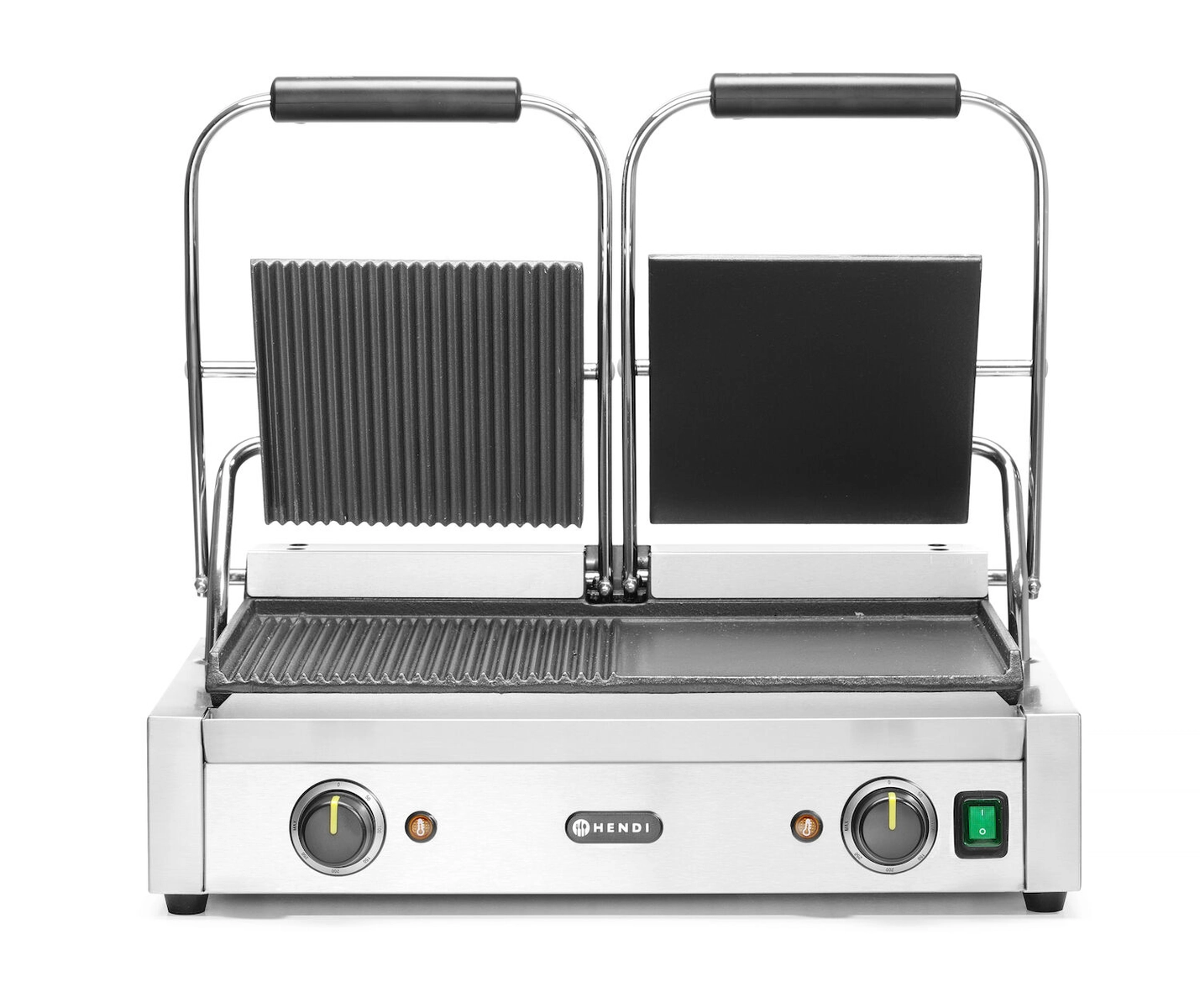 Grill kontaktowy podwójny HENDI to profesjonalny grill kontaktowy gastronomiczny przeznaczony do grillowania i podgrzewania pieczywa, panini, kawałków mięsa, kiełbas oraz warzyw. Połączenie powierzchni gładkiej i ryflowanej, duża moc oraz dwa niezależnie regulowane termostaty sprawiają, że urządzenie doskonale sprawdza się w barach, bistrach, food truckach, lokalach gastronomicznych i punktach szybkiej obsługi, gdzie liczy się wydajność, elastyczność pracy i szybka obróbka termiczna.