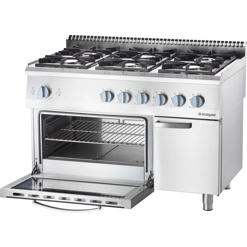Kuchnia gazowa z piekarnikiem gazowym Stalgast 1200x700 – 6-palnikowa kuchnia gastronomiczna na gaz ziemny G20, piekarnik statyczny GN 2/1 6 kW, szafka neutralna z drzwiami, 230 V / 0,025 kW, 1200x700x(H)850 mm