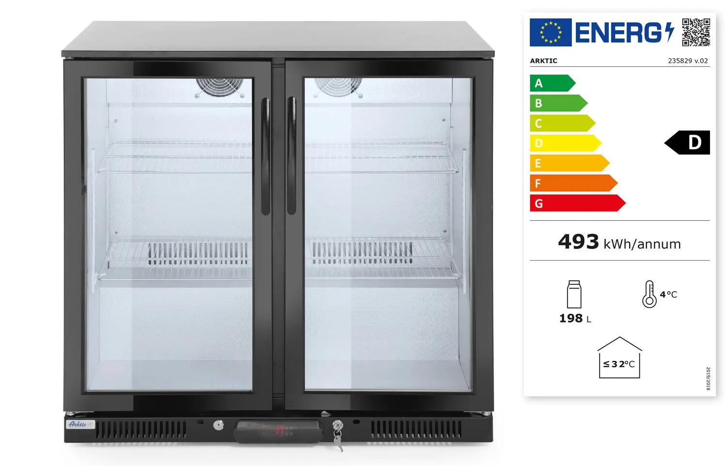 Czarna lodówka barowa Arktic 2-drzwiowa 158 L to kompaktowa lodówka na napoje do baru, pubu i restauracji, wyposażona w przeszklone drzwi na zawiasach z hartowaną szybą, energooszczędne oświetlenie LED oraz chłodzenie statyczne wspomagane wentylatorem. Doskonale sprawdza się jako lodówka ekspozycyjna do butelek i puszek, zapewniając przejrzystą prezentację asortymentu i stabilną temperaturę serwowanych napojów.