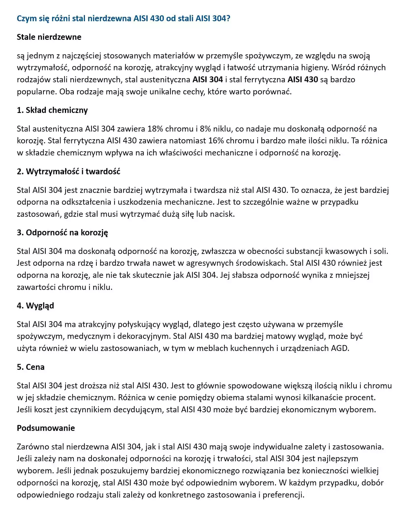 - Materiał: stal nierdzewna AISI 430 ferrytyczna, o zawartości chromu co najmniej 17,5%