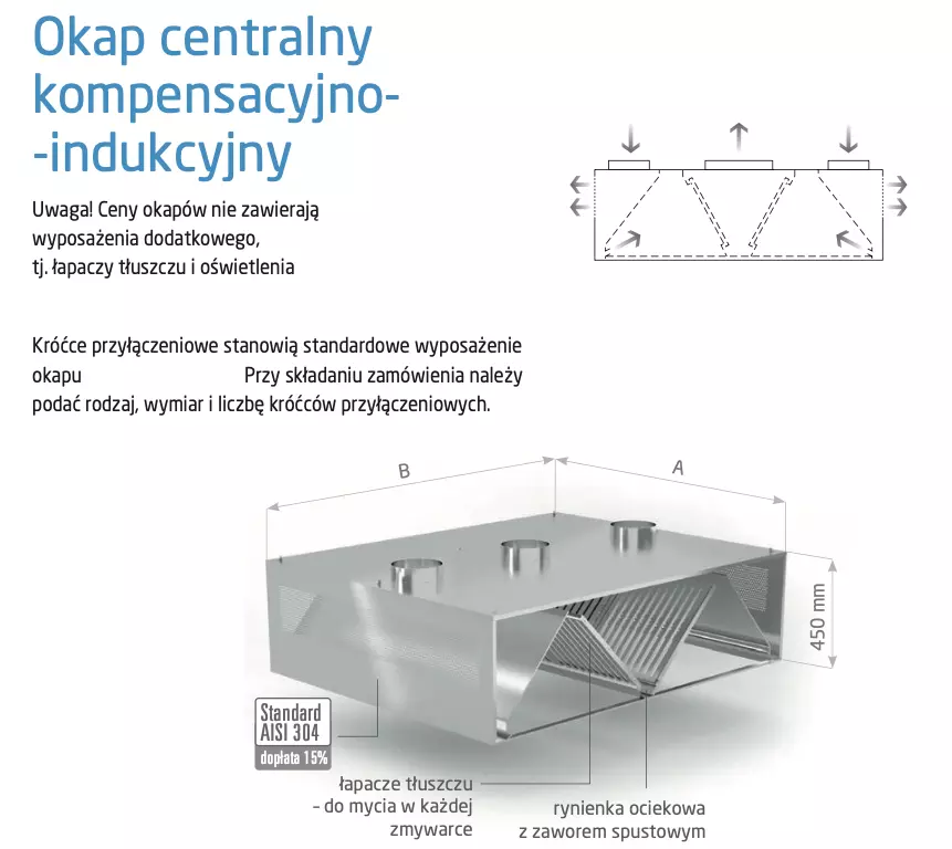 - Model nawiewu: kompensacyjno-indukcyjny – nawiew świeżego powietrza na łapacze tłuszczu oraz do pomieszczenia kuchennego