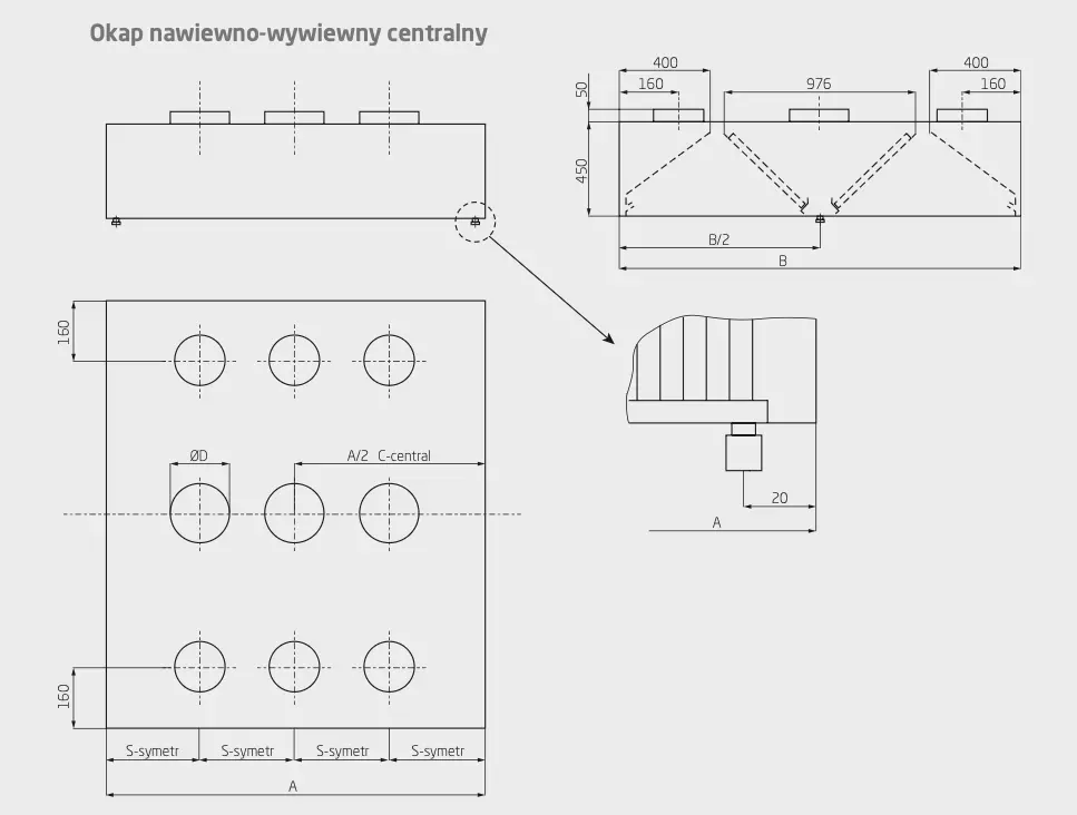 - Okap nie jest wyposażony w wentylatory – jednostki nawiewne i wyciągowe dobierane są osobno, zgodnie z projektem centralnego systemu wentylacji.