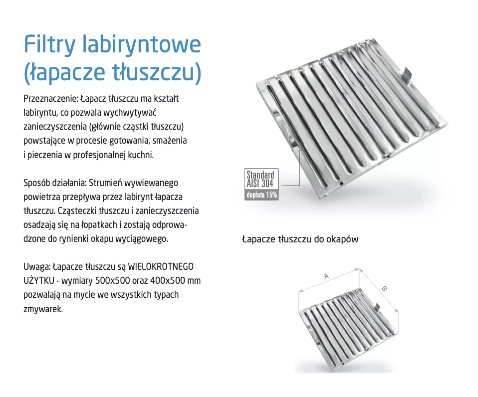 - Łapacze tłuszczu dostępne są jako wyposażenie dodatkowe (opcja za dopłatą) – wielokrotnego użytku, przystosowane do mycia w zmywarkach gastronomicznych.