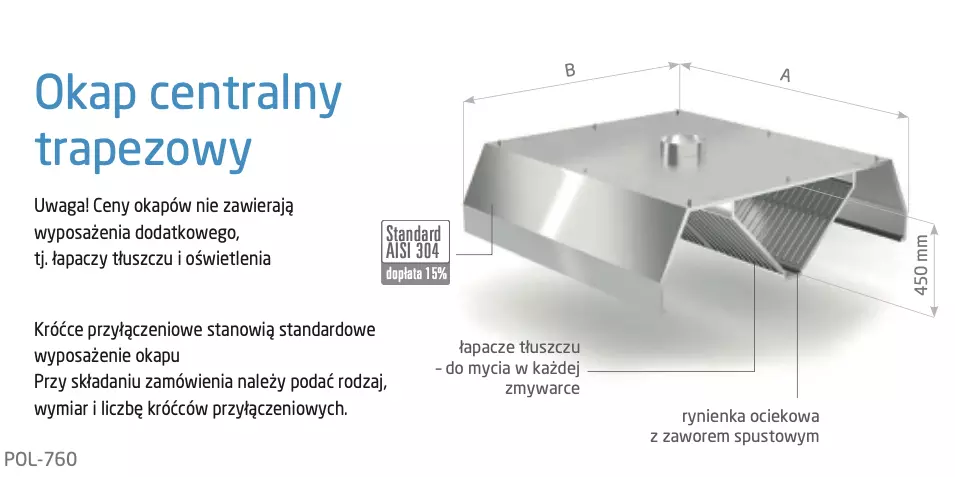 Okap centralny trapezowy POL-760 to profesjonalny okap wywiewny ze stali nierdzewnej do gastronomii, przeznaczony do montażu nad centralnymi wyspami grzewczymi w restauracjach, hotelach, pizzeriach, stołówkach i firmach cateringowych, gdzie kluczowe jest skuteczne odprowadzanie ciepła, pary wodnej i cząsteczek tłuszczu z intensywnie pracującej kuchni.