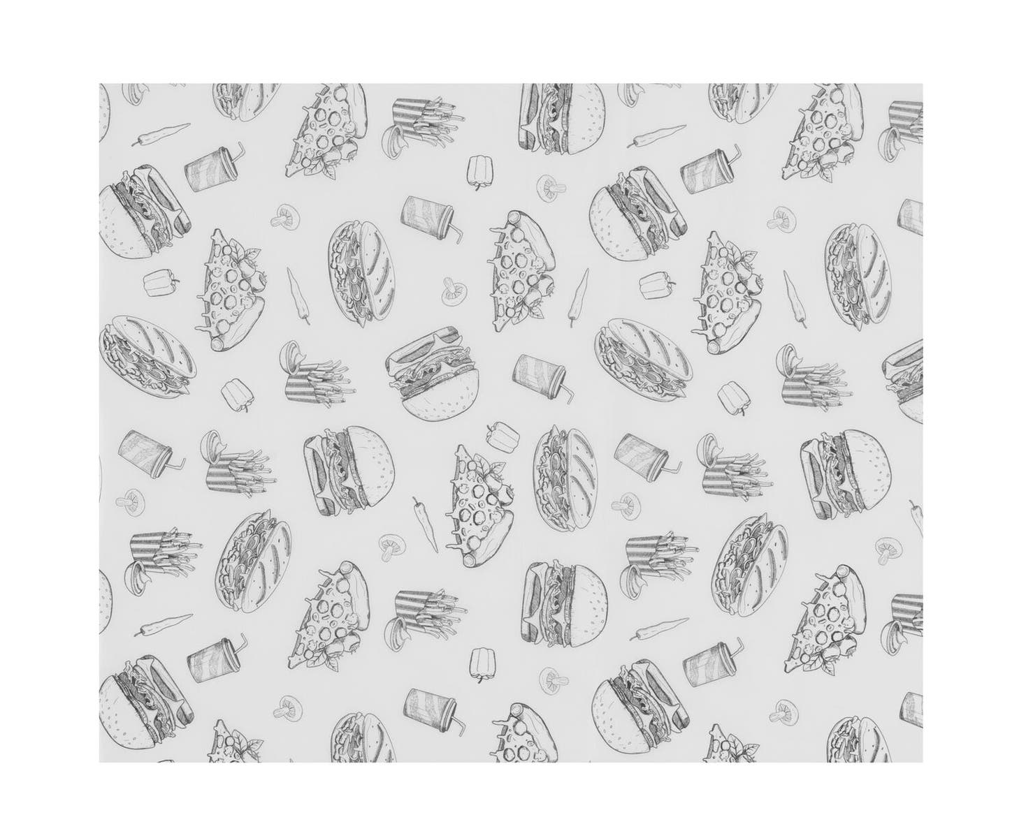 - Czarno-biały wzór z ilustracjami fast food: Stylowy design z tematycznym motywem, który natychmiastowo nadaje charakter podawanym daniom. Idealny do wizualnego wzbogacenia serwowanych zapiekanek, pieczywa, past, sosów czy dań z mielonego mięsa.