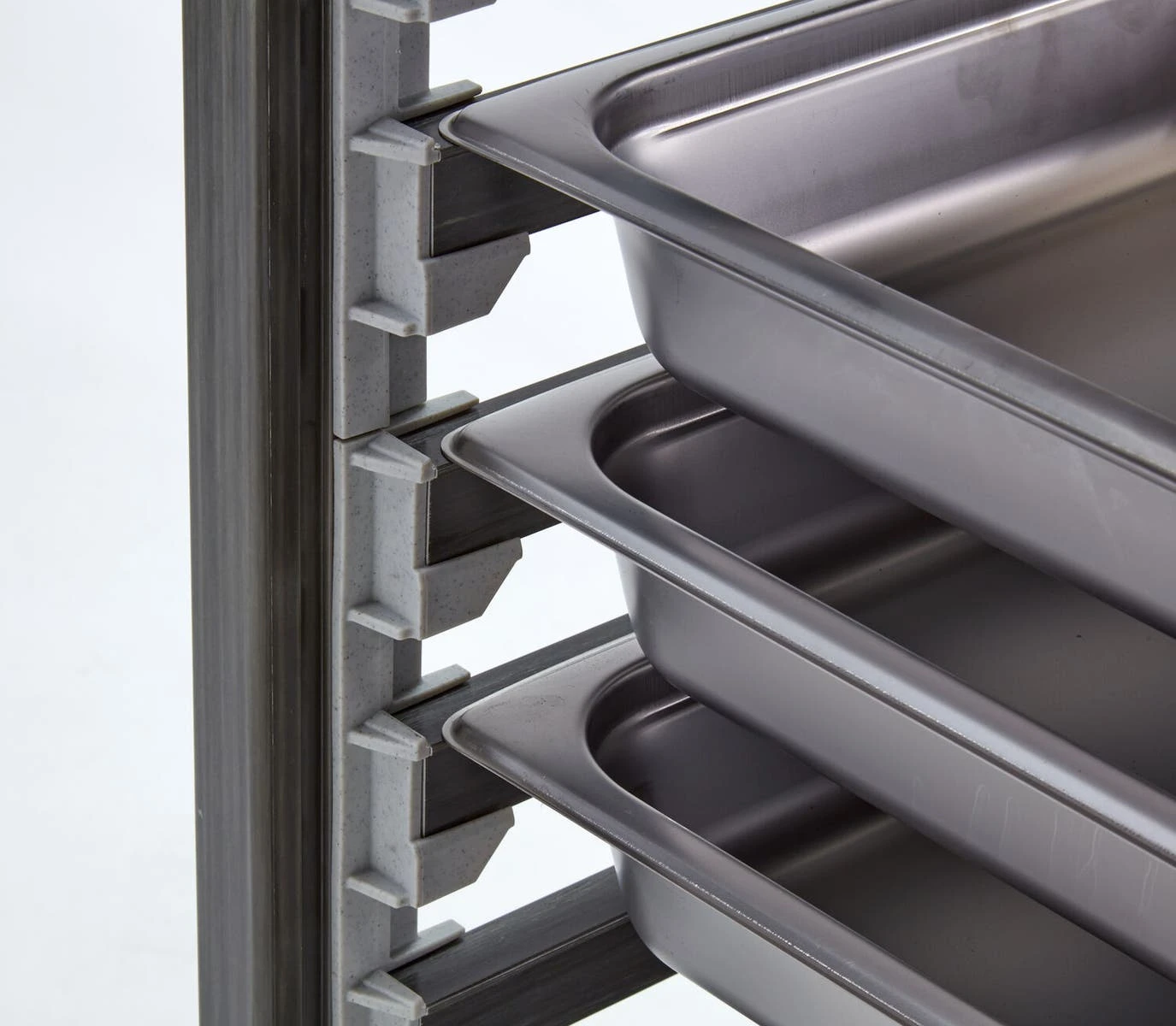 - Duża pojemność: Mieści do 9 pojemników GN 1/1 (H)65 mm lub ich kombinacji (GN 1/2, GN 1/3), z odległością między prowadnicami 76 mm.