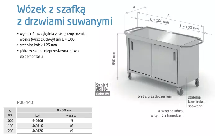 Wózek z szafką z drzwiami suwanymi POL-440, 1000x600x(H)850mm – solidna, spawana konstrukcja ze stali nierdzewnej