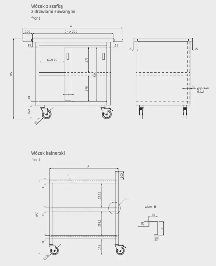 - Wózek z szafką z drzwiami suwanymi do gastronomii – idealny do przechowywania naczyń, pojemników, akcesoriów kuchennych i drobnego sprzętu.